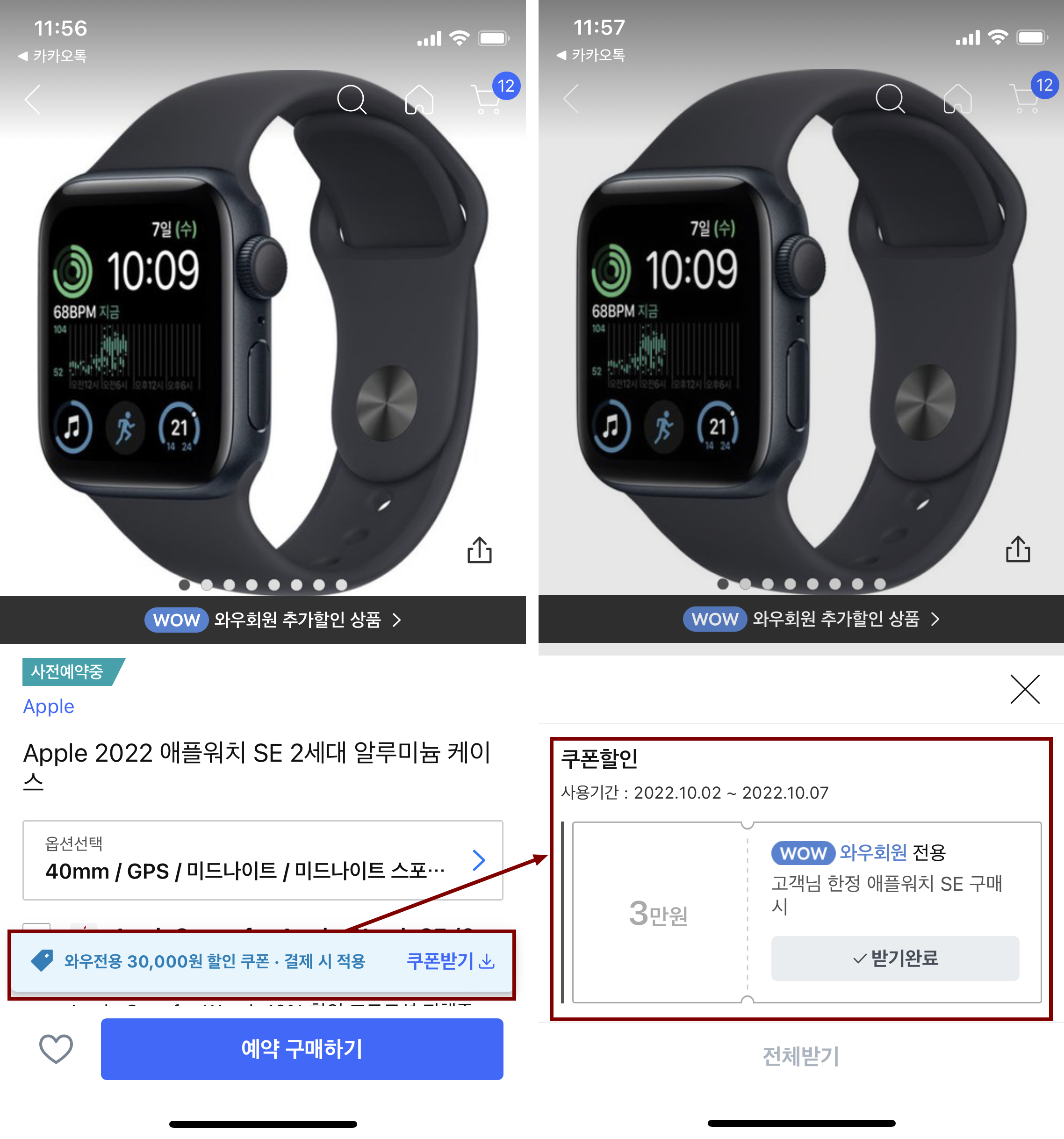 우선 쿠팡와우 회원 계정이 2개 이상이고 다른 계정에 애플워치 SE2를 구매한 적이 없다면, 해당 계정으로 먼저 구매할 것을 추천드립니다.